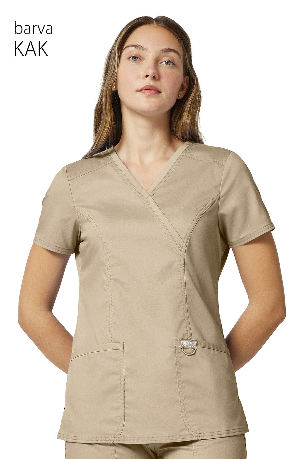 Zdravotnická halenka tričkového sportovního střihu z velmi příjemného textilního materiálu s podílem viskózy a elastanu. V této halence se budete cítit opravdu skvěle. Elastan vám zaručí praktickou pružnost oděvu při práci a viskóza jemný dotyk látky s vaší pokožkou, hebkost a prodyšnost. Halenka Cherokee Revolution WW610 má tričkový projmutý střih, výstřih do V s falešným překladem, zeštíhlující prošití, dvě přední kapsy, poutko na nástroje a boční rozparky. Vytvořte si komplet ze stejné kolekce Cherokee - Revolution s kalhotami WW105.