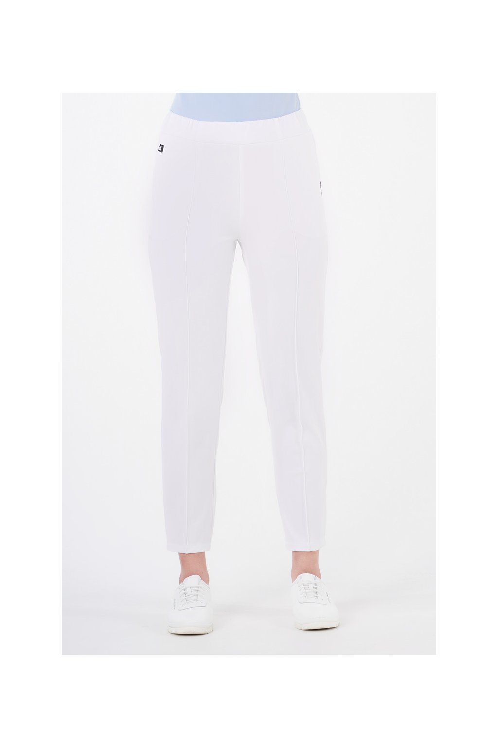 Elegatní dámské zdravotnické kalhoty na puky v 7/8 délce. Zkrácený střih nohavic končí nad kotníky. Střih kalhot je navržen tak, aby odhalil kotníky, působil elegantně, opticky zestříhloval a prodlužoval postavu. Je ideální v kombinaci s výraznou obuví, jako jsou v naší nabídce obuvi sneakersy DUNA. Kalhoty mají praktické 2 boční a 1 zadní kapsu.