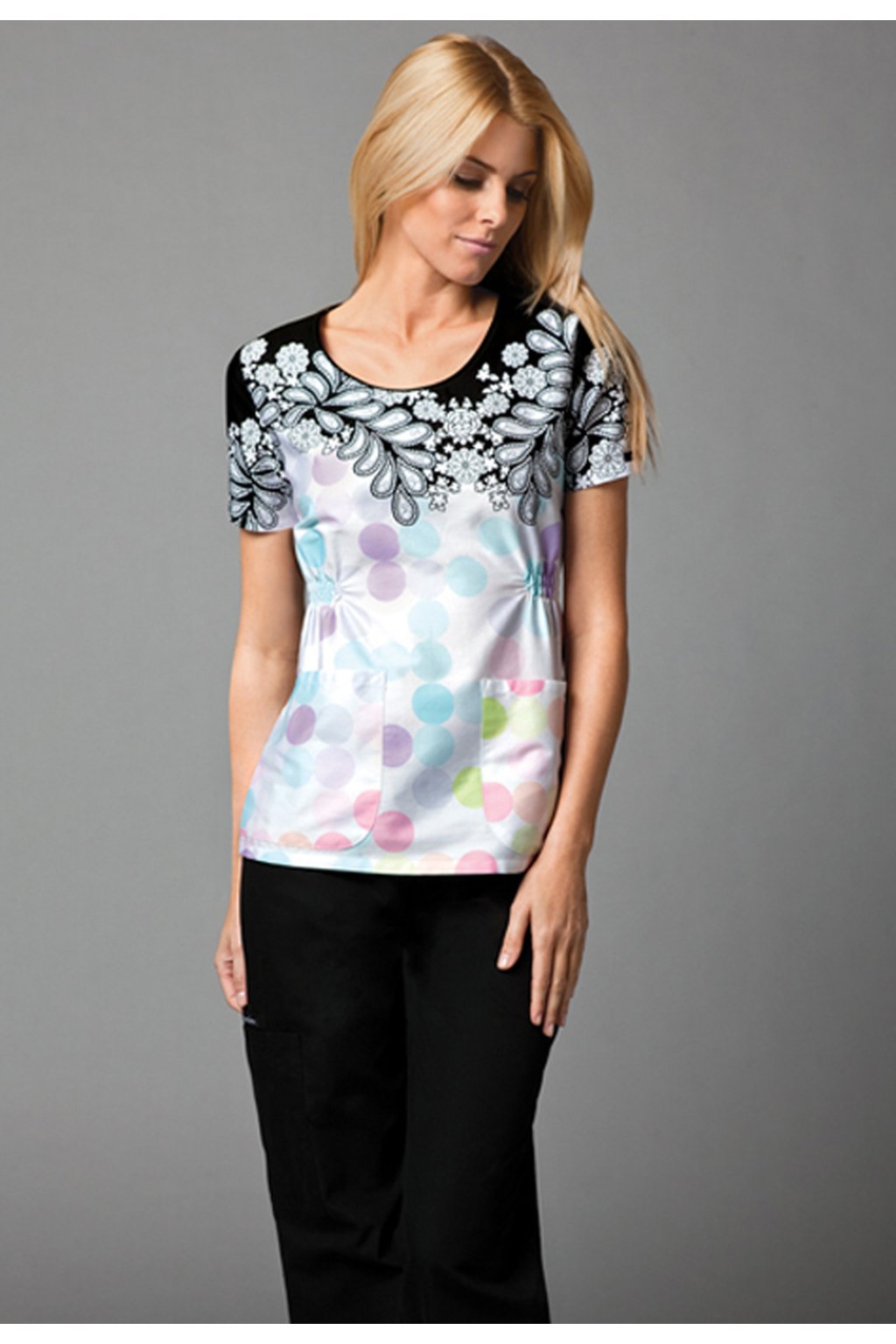 Zdravotnická halenka s potiskem s přírodním abstraktním vzorem z velmi hebké bavlny. Halena má zaoblený výstřih, dvě přední kapsy a boční rozparky.